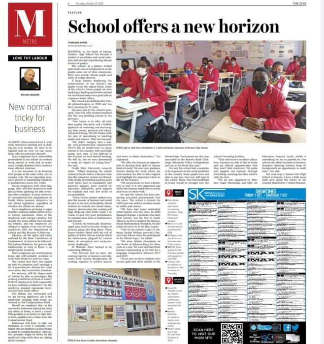 Horizon’un öğrencilerinin ülkenin kamuya ait enerji kurumu Eskom’un bilim olimpiyatlarında altın ve gümüş madalya aldıkları ve Merkez Bankası’nın da düzenlediği yarışmalarda dereceler kazandıklarından bahsedilen yazıda, ülkenin ulusal ve eyalet eğitim bakanlarının da Horizon’dan övgüyle bahsettikleri belirtildi. Haber “Horizon’un ziyaret ettikten sonra ülkem hakkında biraz daha umutlu oldum” sözleri ile tamamlandı.