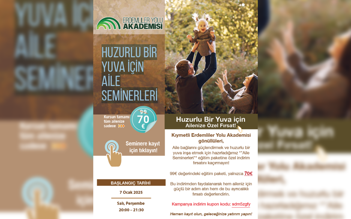 Erdemliler Yolu Akademisi, yeni dönemde aile hayatına katkı sağlayacak, “Huzurlu Bir Yuva İçin Aile Seminerleri” düzenleyecek. 7 Ocak’ta başlayacak olan seminerler, aile bağlarını güçlendirmeyi amaçlıyor.