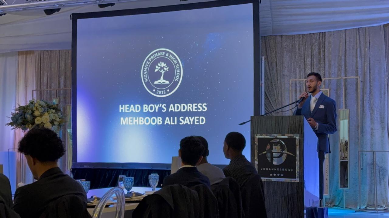 Nizamiye’nin bayan Başkan Öğrencisi Aaliya Amod, öğretmenlerine teşekkürlerini sunarken, Nizamiye Okulu’nun gelişimlerine nasıl yön verdiğini anlattı. Nizamiye’nin Erkek Başkan öğrencisi Mehboob Ali Syed, 2024 mezunlarına veda ederken, zorluklarla başa çıkma güçlerinden ve gösterdikleri başarıdan övgüyle bahsetti. Rumi’den alıntı yaparak, mezunları geleceğe umutla bakmaya teşvik etti. Mezuniyet sınıfı adına, Mezuniyet Yemeği’ne katılan Başkan Yardımcısına bir hediye sundu.