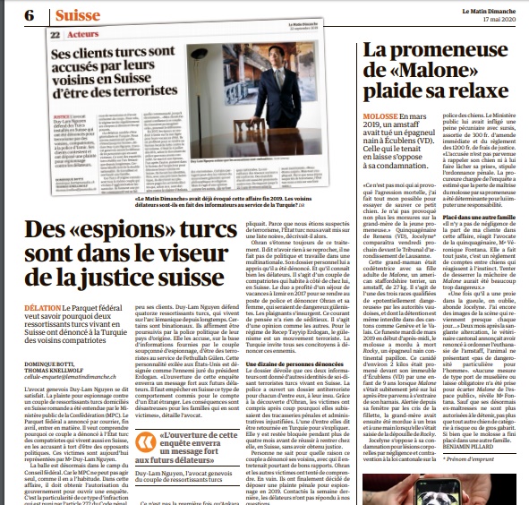 Mağdurlar Eylül 2019’de bu çift hakkında İsviçre Federal Savcılığına 200 bin İsviçre Frank tazminat talebiyle suç duyurusunda bulunmuştu. Duyuruda, içlerinde ‘terörist’ tabirinin de bulunduğu lekeleme (defamasyon) ve yalan beyan suçları da yer aldı.