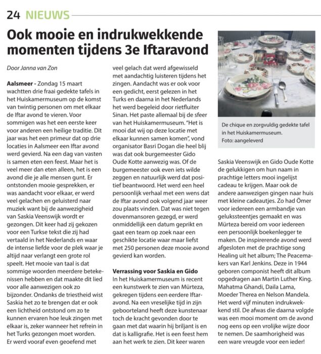 Hollanda’nın köklü yerel gazetelerinden Aalsmeer Nieuwe Meerbode, kentte düzenlenen 3. geleneksel iftar programına geniş yer ayırdı. Gazeteci Janna van Zon’ın yayımlanan haberinde, Huiskamermuseum’da (Müze Ev) gerçekleşen buluşmanın toplumsal birliktelik adına sergilediği duygusal ve sanatsal derinlik ön plana çıkarıldı.