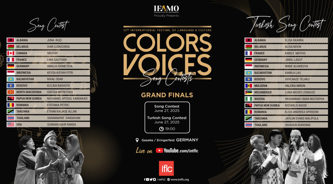 Uluslararası Dil ve Kültür Festivali (IFLC)’nin 23.Yıl etkinlikleri Almanya’da yapılacak şarkı yarışmaları ile başlıyor. 28 Haziran tarihine kadar Nordrhein-Westfalen eyaletinin Paderborn kentinde düzenlenecek olan finallere bu sene 14’i ‘Türkçe Şarkı Yarışması’ (Colors of Voices Türkçe) ve 14’ü ‘Uluslararası Şarkı Yarışması’ (Colors of Voices) için toplam 28 finalist katılacak. Dünyanın farklı ülkelerinden Almanya’da sahneye çıkacak genç yetenekler dereceye girmek için yarışacak.