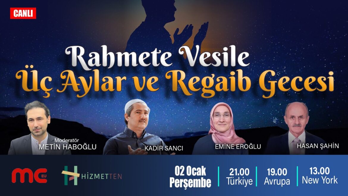 Regaip Kandili Özel Yayını 02 Ocak Perşembe akşamı Avrupa saati ile 19.00’da Hizmetten Youtube ve MC Tv ortak yayınında sizlerle.
