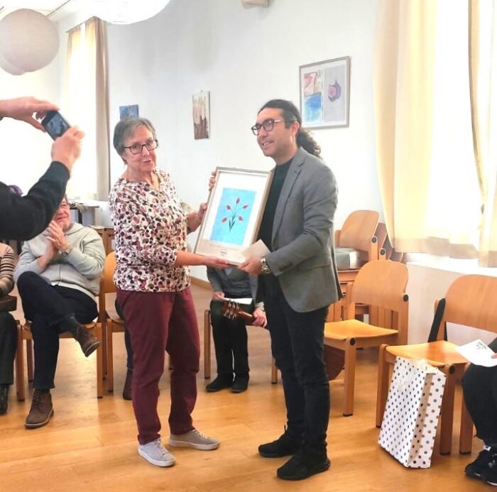Dernek başkanı Ömer Yılmaz, ev sahibi Christa Patek’e bu özel gün anısına dernek adına Anadolu kültürünün simgesel bir parçası olan bir Ebru sanat eseri hediye etti.